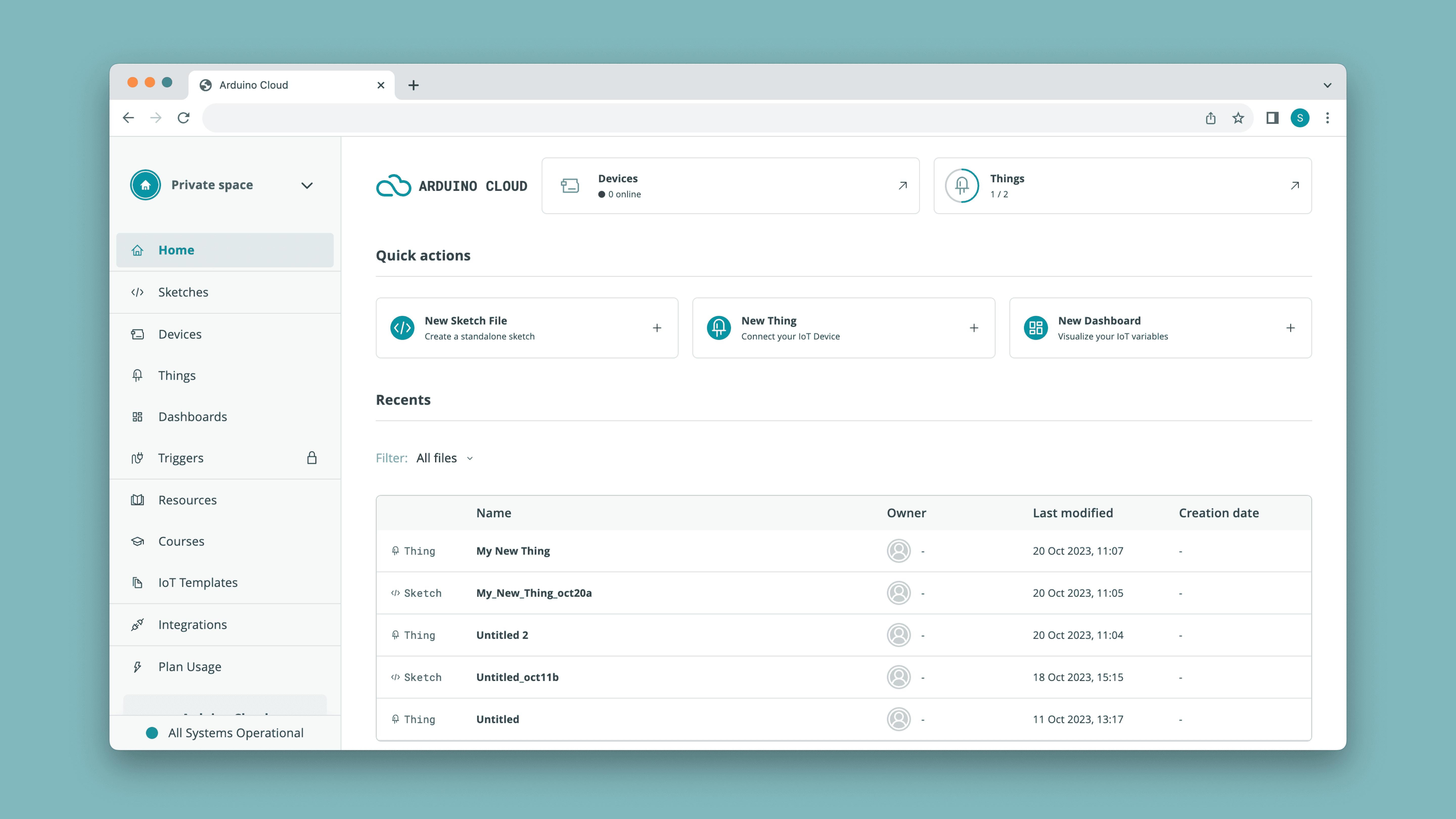 The Arduino Cloud home page.