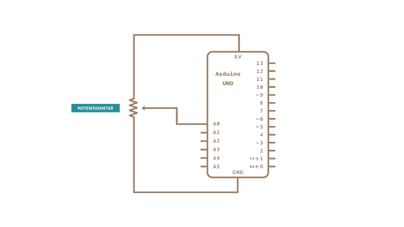 The Arduino boards have a circuit inside called an analog-to-digital converter or ADC that reads this changing voltage and converts it to a number between 0 and 1023. When the shaft is turned all the way in one direction, there are 0 volts going to the pin, and the input value is 0. When the shaft is turned all the way in the opposite direction, there are 5 volts going to the pin and the input value is 1023. In between, analogRead() returns a number between 0 and 1023 that is proportional to the amount of voltage being applied to the pin.