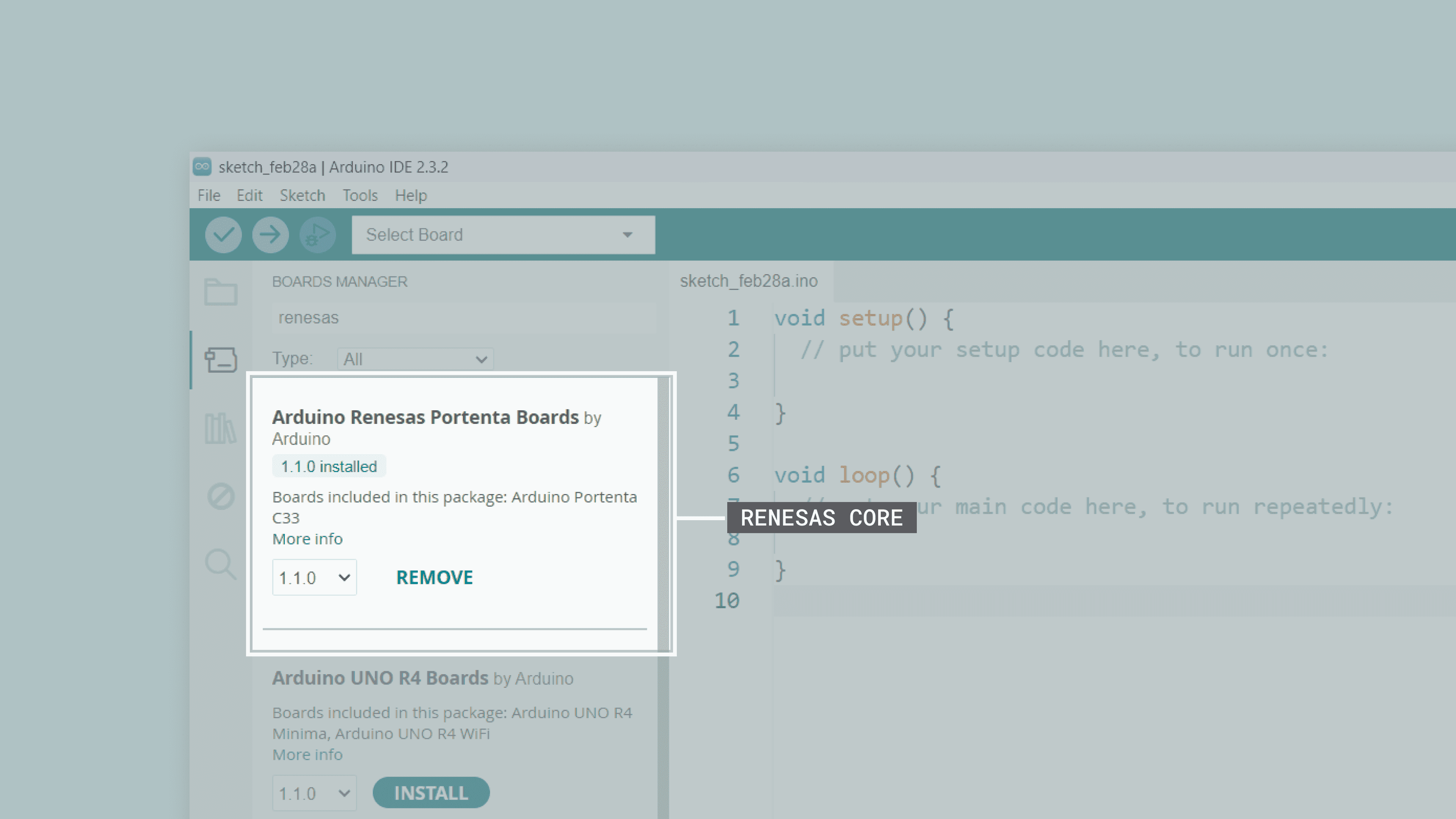 Before installing the MicroPython firmware, ensure you have installed the latest Portenta Renesas board package. To install the board package for the Portenta C33 board, navigate to Tools > Board > Boards Manager or click the Boards Manager icon in the left tab of the IDE. In the Boards Manager tab, search for