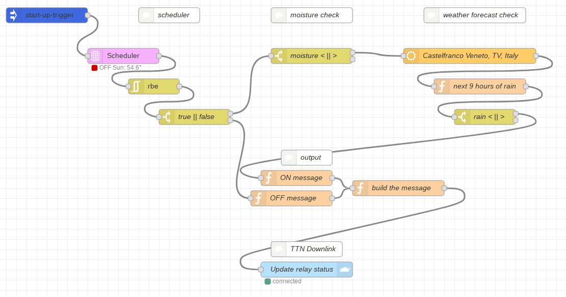 1[{"id":"197f29f7.4643d6","type":"light-scheduler","z":"c9ea9bc1.58fd68","settings":"980aa786.731a58","events":"[{\"start\":{\"dow\":3,\"mod\":990},\"end\":{\"dow\":3,\"mod\":1020}},{\"start\":{\"dow\":1,\"mod\":390},\"end\":{\"dow\":1,\"mod\":510}},{\"start\":{\"dow\":5,\"mod\":390},\"end\":{\"dow\":5,\"mod\":510}}]","topic":"","name":"Scheduler","onPayload":"true","onPayloadType":"bool","offPayload":"false","offPayloadType":"bool","onlyWhenDark":true,"sunElevationThreshold":6,"sunShowElevationInStatus":true,"outputfreq":"output.statechange.startup","x":270,"y":1040,"wires":[["ba7ef794.54c098"]]},{"id":"ba7ef794.54c098","type":"rbe","z":"c9ea9bc1.58fd68","name":"","func":"rbe","gap":"","start":"","inout":"out","property":"payload","x":330,"y":1100,"wires":[["657bd700.f2e3f8"]]},{"id":"4e141e03.beb92","type":"start-up-trigger","z":"c9ea9bc1.58fd68","x":120,"y":960,"wires":[["197f29f7.4643d6"]]},{"id":"7c78353f.ae1f3c","type":"openweathermap","z":"c9ea9bc1.58fd68","name":"Castelfranco Veneto, TV, Italy","wtype":"forecast","lon":"","lat":"","city":"Treviso","country":"Italy","language":"en","x":950,"y":1040,"wires":[["f71443de.0c70f"]]},{"id":"f71443de.0c70f","type":"function","z":"c9ea9bc1.58fd68","name":"next 9 hours of rain","func":"/*\nhttps://openweathermap.org/forecast5\nlist.rain\nlist.rain.3h Rain volume for last 3 hours, mm\n*/\n\nforecast = msg.payload;\nslot_to_check = 4;\n\nvar rain = 0;\nfor (var i=0; i< slot_to_check; i++) {\n var isN = parseInt(forecast[i].rain['3h']);\n if (isN) {\n rain += forecast[i].rain['3h'];\n } \n \n}\nmsg.payload = rain;\nreturn msg;","outputs":1,"noerr":0,"x":970,"y":1100,"wires":[["2fe18ce1.81ad54"]]},{"id":"657bd700.f2e3f8","type":"switch","z":"c9ea9bc1.58fd68","name":"true || false","property":"payload","propertyType":"msg","rules":[{"t":"true"},{"t":"false"}],"checkall":"true","repair":false,"outputs":2,"x":410,"y":1160,"wires":[["5b8d5f8c.3e2bf"],["35be5ee9.7bf612"]]},{"id":"5b8d5f8c.3e2bf","type":"switch","z":"c9ea9bc1.58fd68","name":"moisture < || >","property":"moisture","propertyType":"flow","rules":[{"t":"lt","v":"512","vt":"num"},{"t":"else"}],"checkall":"true","repair":false,"outputs":2,"x":640,"y":1040,"wires":[["7c78353f.ae1f3c"],[]]},{"id":"2fe18ce1.81ad54","type":"switch","z":"c9ea9bc1.58fd68","name":"rain < || >","property":"payload","propertyType":"msg","rules":[{"t":"lt","v":"15","vt":"num"},{"t":"else"}],"checkall":"true","repair":false,"outputs":2,"x":980,"y":1160,"wires":[["1543164a.251a2a"],[]]},{"id":"1543164a.251a2a","type":"function","z":"c9ea9bc1.58fd68","name":"ON message ","func":"var content = \"{\\\"status\\\":1}\";\n\nmsg.payload = content;\nreturn msg;","outputs":1,"noerr":0,"x":610,"y":1280,"wires":[["ce2e4686.5e6448","d891debb.5667b"]]},{"id":"35be5ee9.7bf612","type":"function","z":"c9ea9bc1.58fd68","name":"OFF message ","func":"var content = \"{\\\"status\\\":0}\";\n\nmsg.payload = content;\nreturn msg;","outputs":1,"noerr":0,"x":600,"y":1320,"wires":[["ce2e4686.5e6448"]]},{"id":"ebad1adc.8d2a58","type":"comment","z":"c9ea9bc1.58fd68","name":"scheduler","info":"","x":360,"y":960,"wires":[]},{"id":"a125831.cc53b8","type":"comment","z":"c9ea9bc1.58fd68","name":"moisture check","info":"","x":640,"y":960,"wires":[]},{"id":"d43a1d51.ff7f4","type":"comment","z":"c9ea9bc1.58fd68","name":"weather forecast check","info":"","x":960,"y":960,"wires":[]},{"id":"3b4e826f.72c02e","type":"comment","z":"c9ea9bc1.58fd68","name":"output","info":"","x":630,"y":1240,"wires":[]},{"id":"ce2e4686.5e6448","type":"function","z":"c9ea9bc1.58fd68","name":"build the message","func":"var content = msg.payload;\nvar downlink = \"\";\n\nfor(var i=0;i<content.length;i++) {\n downlink += ''+content.charCodeAt(i).toString(16);\n}\n\nmsg.dev_id = \"mkr1300_02\";\nmsg.payload = downlink;\n\nreturn msg;","outputs":1,"noerr":0,"x":810,"y":1300,"wires":[["aebe5bc0.97b378","d891debb.5667b"]]},{"id":"aebe5bc0.97b378","type":"ttn downlink","z":"c9ea9bc1.58fd68","name":"Update relay status","app":"594f24fc.25ca4c","dev_id":"","port":"1","confirmed":true,"schedule":"replace","x":630,"y":1460,"wires":[]},{"id":"fd350223.1be83","type":"comment","z":"c9ea9bc1.58fd68","name":"TTN Downlink","info":"","x":630,"y":1420,"wires":[]},{"id":"f92be7b6.92bbf8","type":"inject","z":"c9ea9bc1.58fd68","name":"Manual ON","topic":"","payload":"","payloadType":"date","repeat":"","crontab":"","once":false,"onceDelay":0.1,"x":390,"y":1280,"wires":[["1543164a.251a2a"]]},{"id":"22a57118.758aae","type":"inject","z":"c9ea9bc1.58fd68","name":"Manual OFF","topic":"","payload":"","payloadType":"date","repeat":"","crontab":"","once":false,"onceDelay":0.1,"x":390,"y":1320,"wires":[["35be5ee9.7bf612"]]},{"id":"d891debb.5667b","type":"debug","z":"c9ea9bc1.58fd68","name":"","active":true,"tosidebar":true,"console":false,"tostatus":false,"complete":"true","x":1020,"y":1280,"wires":[]},{"id":"980aa786.731a58","type":"light-scheduler-settings","z":"","name":"FabLabCfv","latitude":"45.67304890","longitude":"11.95903480"},{"id":"594f24fc.25ca4c","type":"ttn app","z":"","appId":"farm_sensor_network","accessKey":"your-access-key","discovery":"discovery.thethingsnetwork.org:1900"}]Now you have a complete setup: you can start doing precision farming.