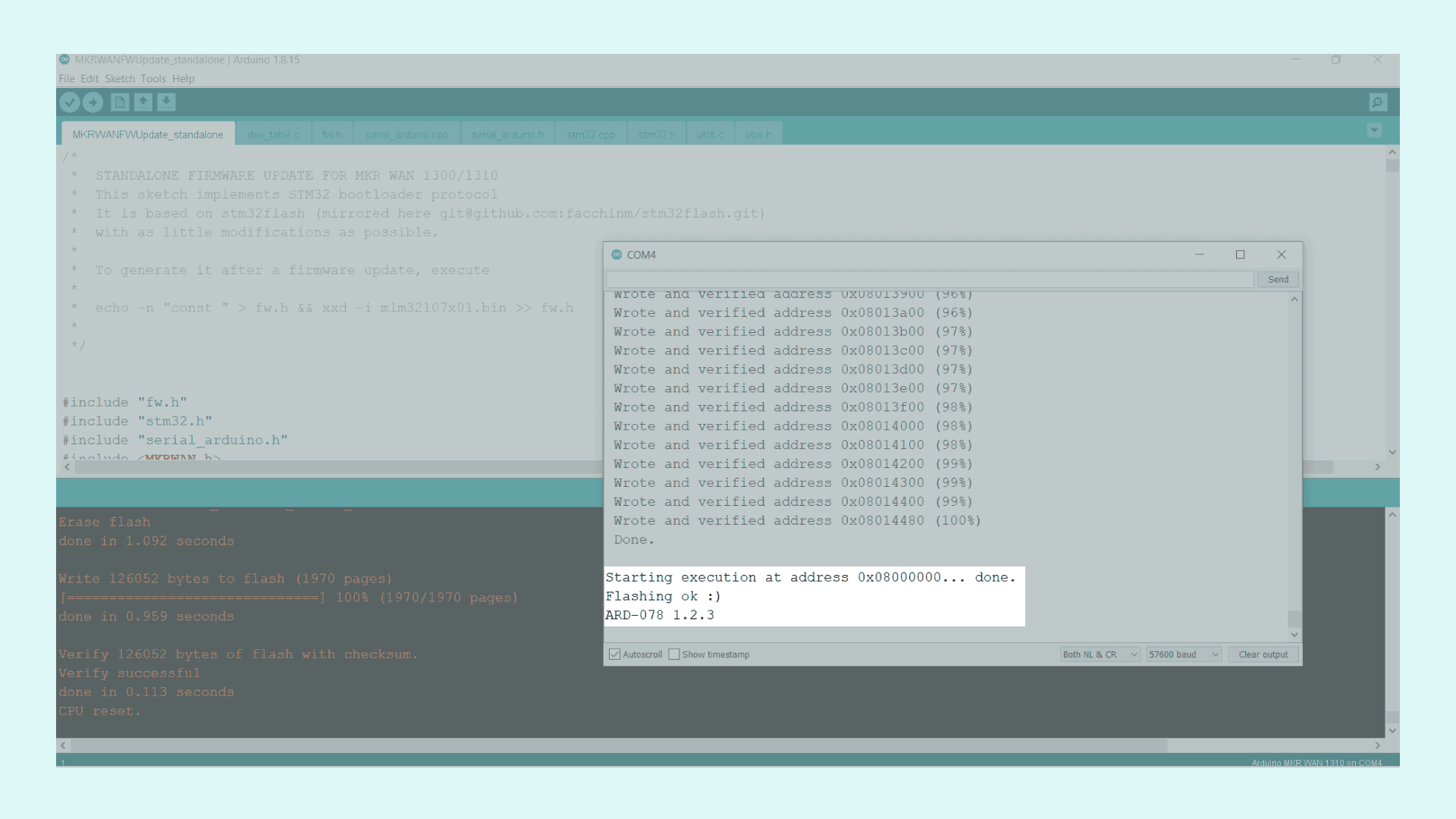 Before we can use the MKRWAN library a firmware update of the LoRa® module of our MKR 1310 board is recommended. Updating the module's firmware can be done easily with the MKRWANFWUpdate_standalone sketch. We can find this sketch in File > Examples > MKRWAN > MKRWANFWUpdate_standalone. After uploading the sketch, we should see the following output in the Arduino IDE Serial Monitor when the firmware update is done: