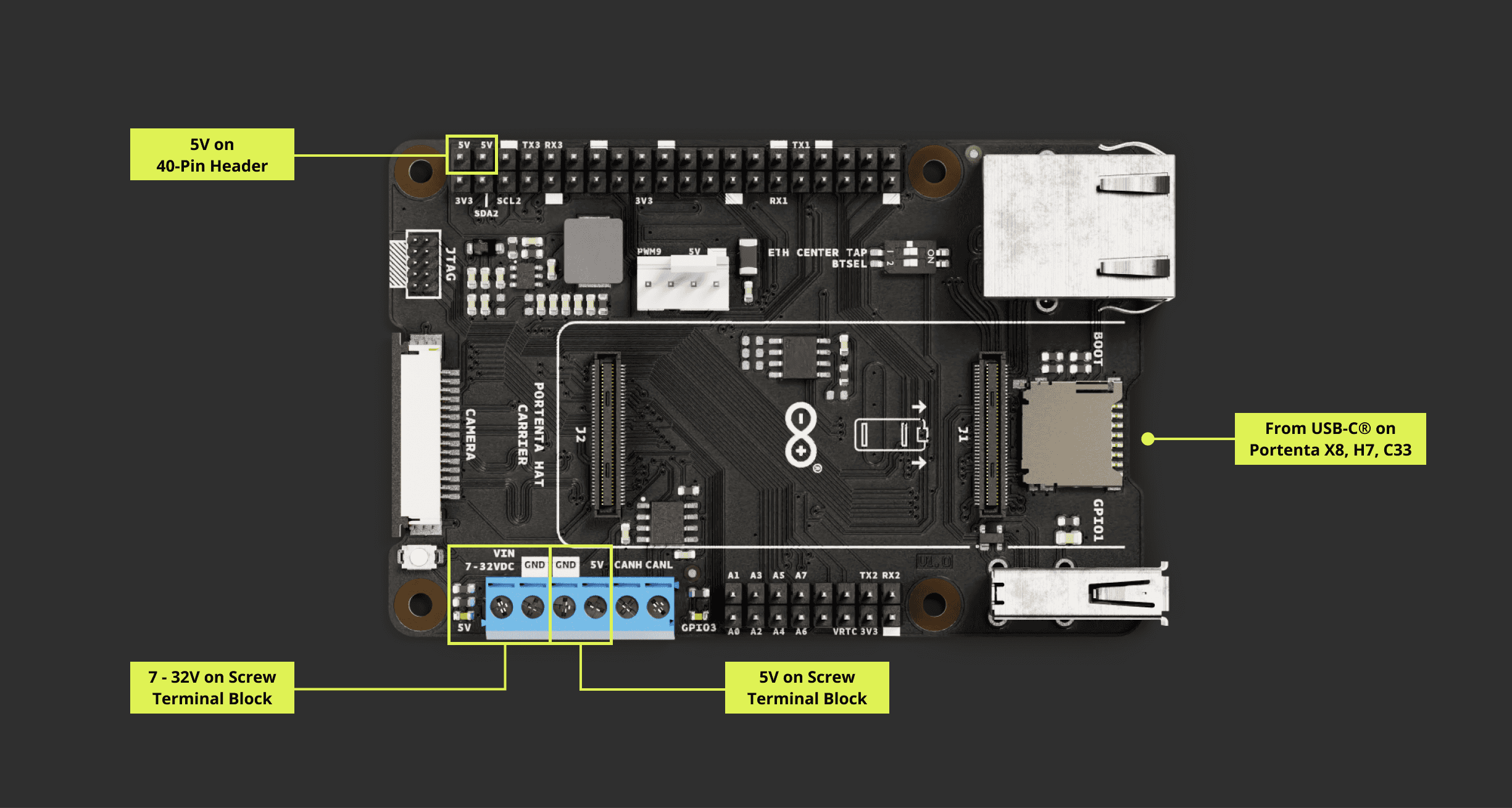 Power management: The board can be powered up from different sources. The onboard screw terminal block allows a 7-32 V power supply to power the Portenta board and the carrier, and a 5 V power supply.