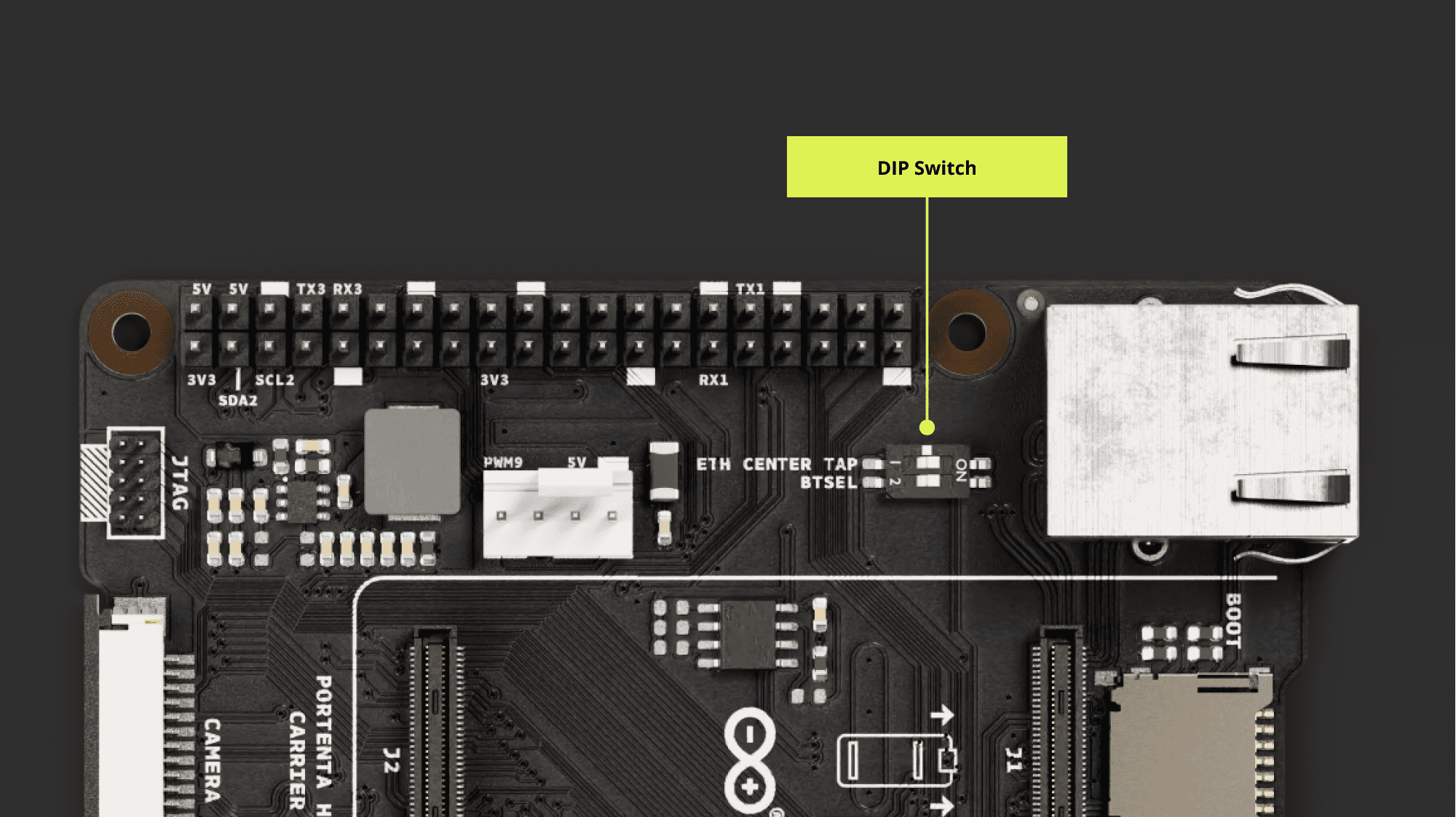 DIP switch: The carrier features a DIP switch with two positions, allowing for different profiles depending on the paired Portenta board. This DIP switch includes both the ETH CENTER TAP and BTSEL switches.